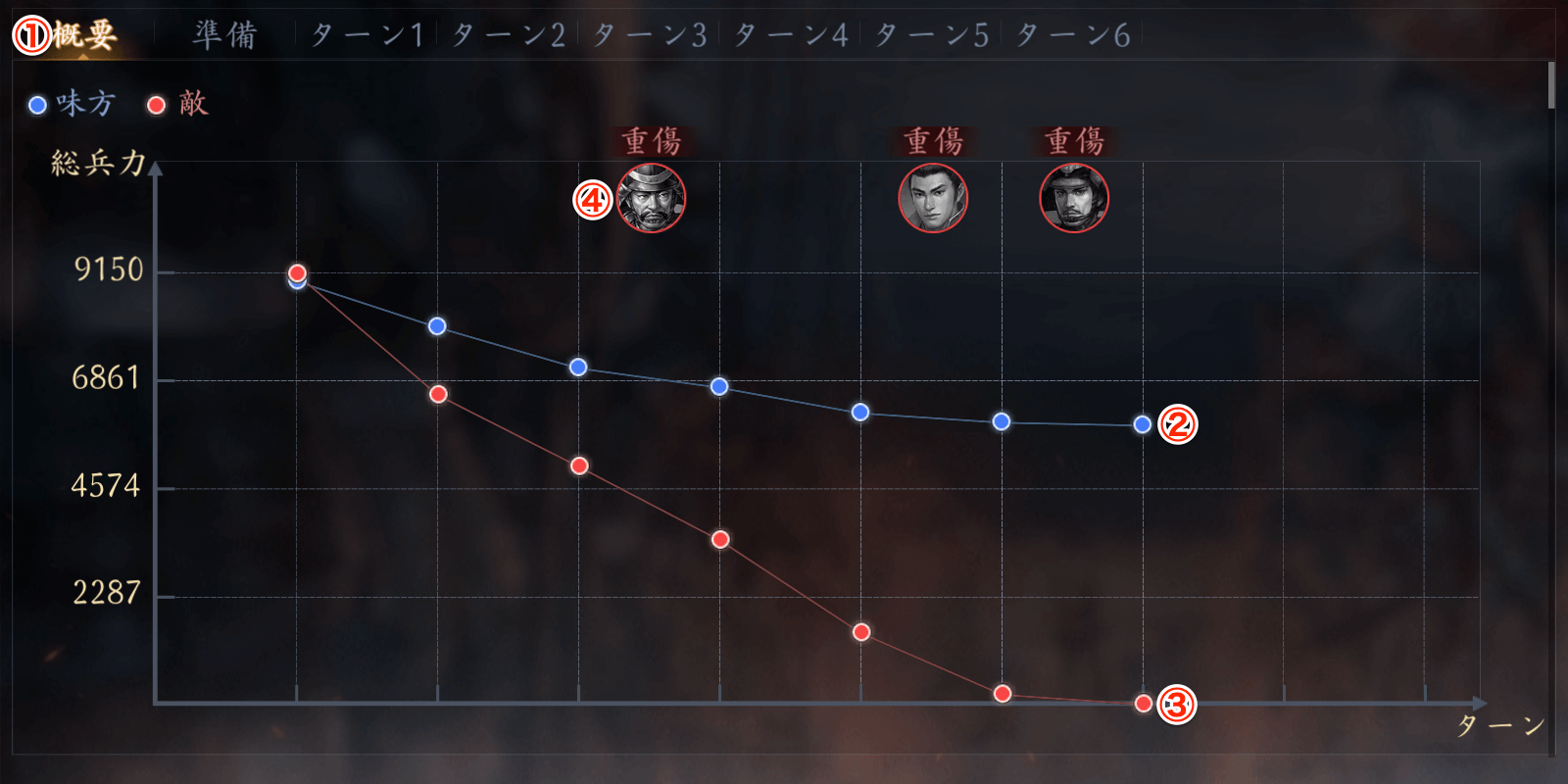 | ③ | 敵の総兵力(赤いグラフ)敵部隊の兵力推移を示す |