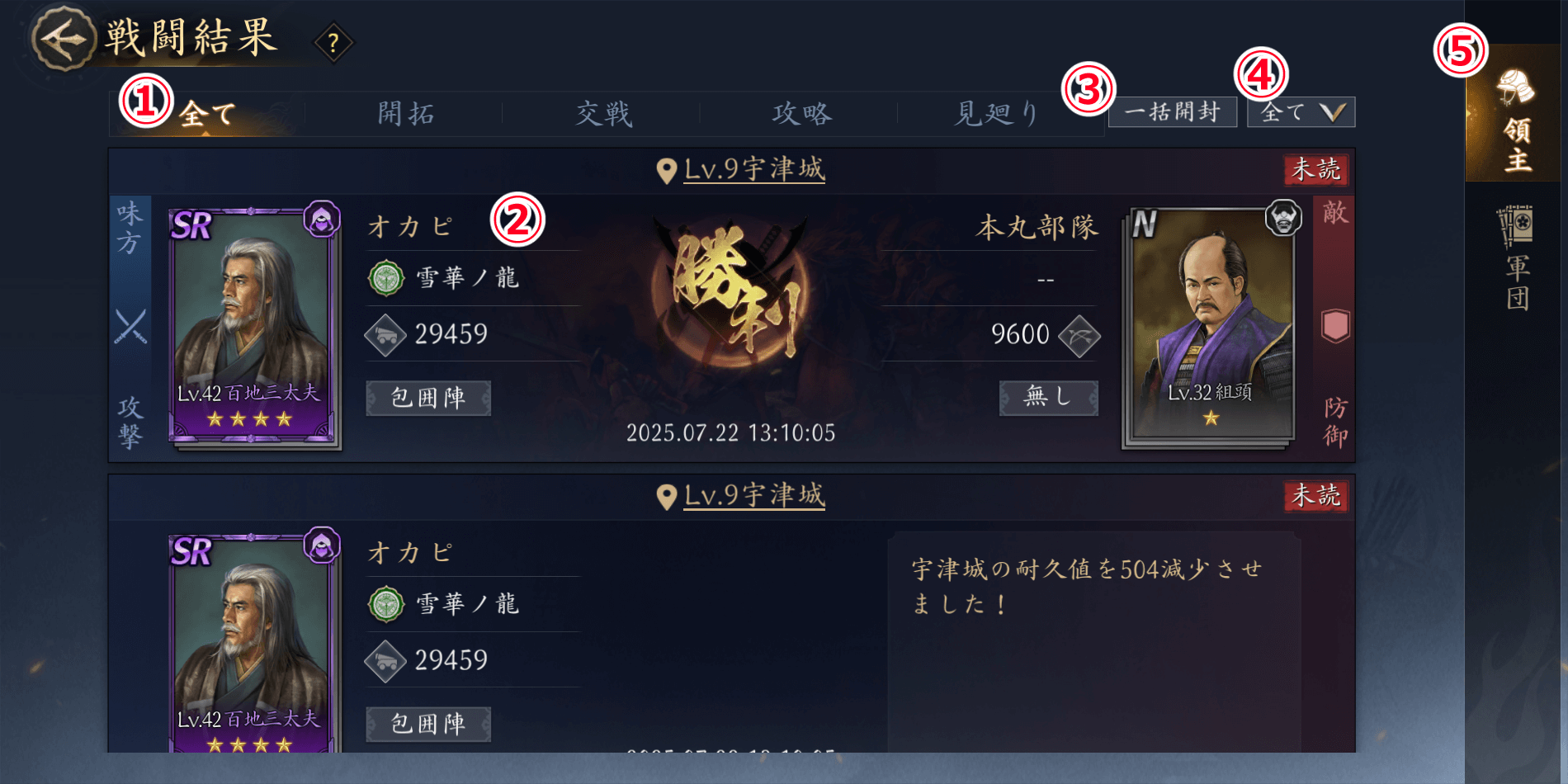 | ⑤ | 領主・軍団の表示切り替え自身のみの戦闘結果と、軍団のメンバー全員の戦闘結果の表示を切り替えられる |
