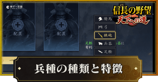 『信長の野望 天下への道』(信長天下道)の兵種の種類と特徴を紹介。有利不利や強化方法についても掲載しているため、信長天下道で兵種について知りたい時の参考にどうぞ。