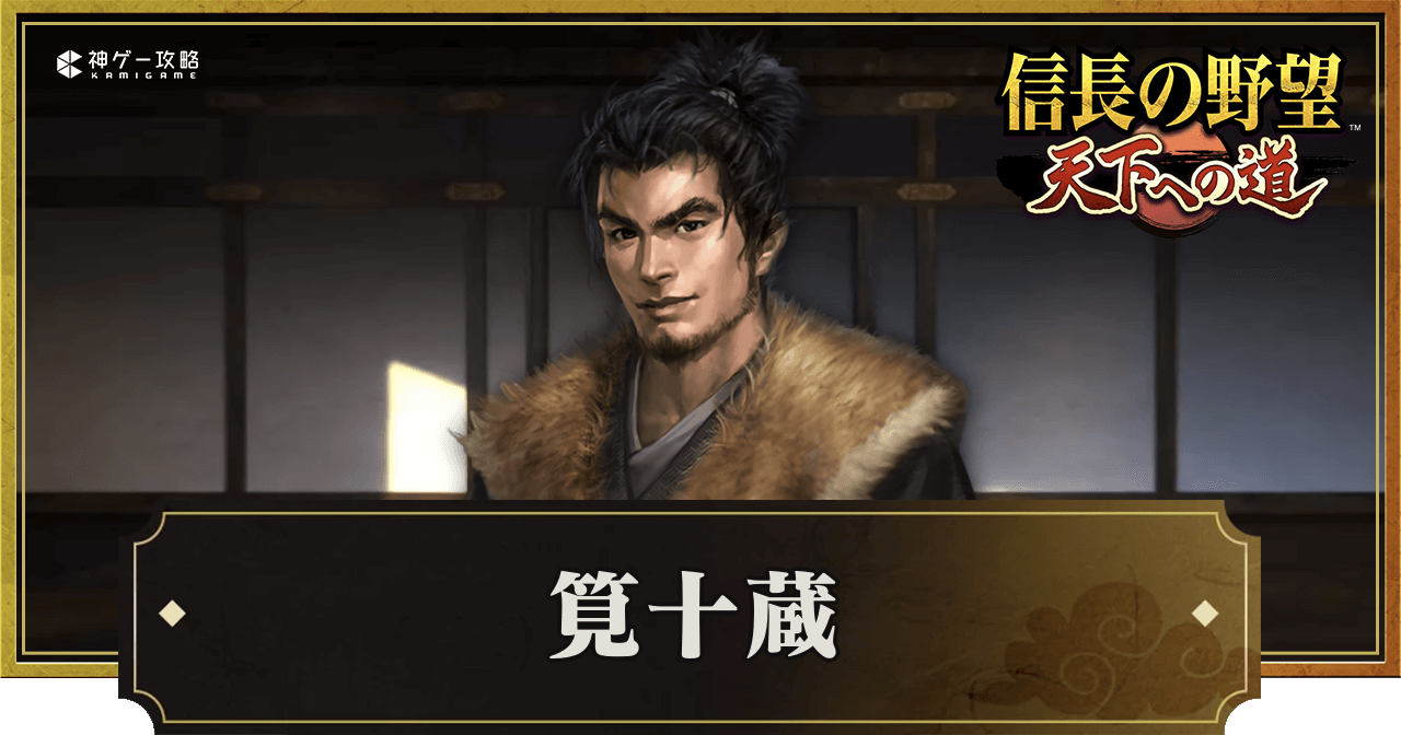 『信長の野望 天下への道』(信長天下道)の筧十蔵の評価と性能を紹介。戦法や詳細なステータスだけでなく、列伝や声優についても掲載しているため、信長天下道で筧十蔵について知りたい時の参考にどうぞ。