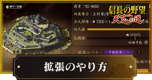 『信長の野望 天下への道』(信長天下道)の拡張を紹介。拠点拡張のやり方やメリット、拡張する時の注意点についても掲載しているため、信長天下道で拡張について知りたい時の参考にどうぞ。