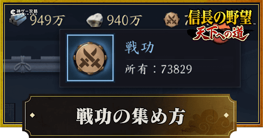 戦功は、攻城戦で耐久を削る際に倒す本丸部隊との戦闘で入手できる。攻略を1回行う事に継続して入手できるため、二の丸部隊を削ったら兵器部隊を多く用意して戦功を稼ごう。