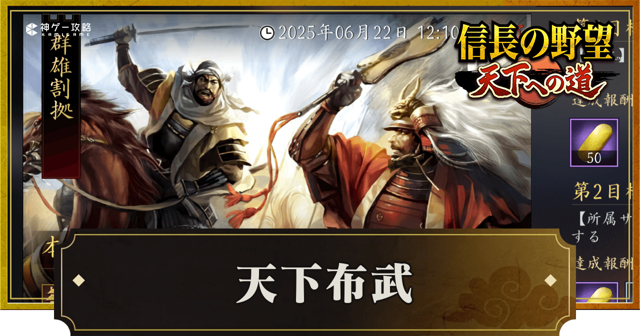 天下布武は、勢力や軍団に関係なく、サーバー内のプレイヤー全員で達成を目指す共通目標だ。各地の城の占拠状況などに応じて進行し、各章の目標を達成するとサーバー参加者全員が報酬として金を獲得でき、更に祭礼や市場などの評定の各種機能が順次解禁されていく。