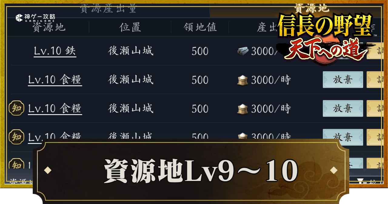 『信長の野望 天下への道』(信長天下道)の資源地Lv9~10を紹介。資源地レベル9~10の取り方や場所、おすすめの編制(編成)についても掲載しているため、信長天下道で資源地獲得を進める際の参考にどうぞ。