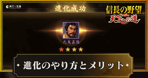 『信長の野望 天下への道』(信長天下道)の進化について紹介。進化の手順や進化するメリット、注意点についても掲載しているため、信長天下道で進化について知りたい時の参考にどうぞ。