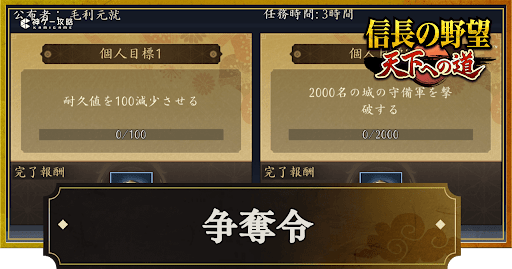 争奪令では、報酬付きの全体目標を設定できる。争奪令には包囲値や耐久を削るなど、攻城戦に必要な要素で目標が設定されており、クリアすると戦功を追加で獲得可能だ。