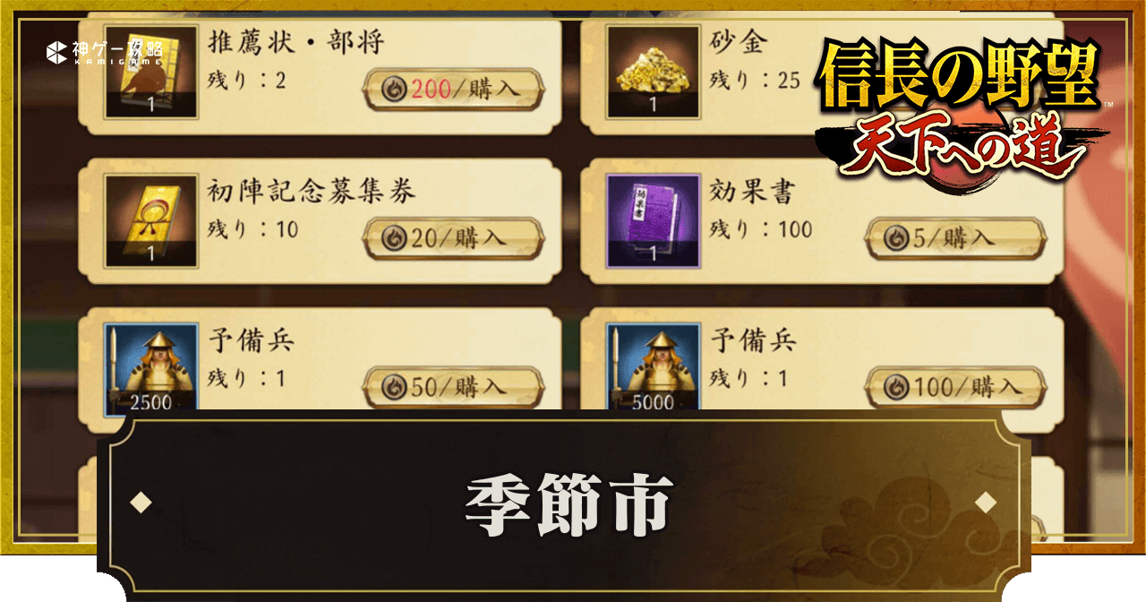 『信長の野望 天下への道』(信長天下道)の季節市について紹介。オススメ交換アイテムや季節市で交換できるアイテムの一覧についても掲載しているため、信長天下道で季節市について知りたい時の参考にどうぞ。