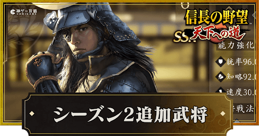 『信長の野望 天下への道』(信長天下道)のシーズン2追加武将を紹介。シーズン2で新規追加された武将やSRからSSRに昇格して実装された武将についても掲載しているため、信長天下道でシーズン2追加武将について知りたい時の参考にどうぞ。