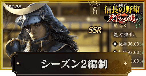 『信長の野望 天下への道』(信長天下道)のシーズン2武将のおすすめ編制例を紹介。シーズン2の注目武将や具体的な編制例についても掲載しているため、信長天下道でシーズン2武将について知りたい時の参考にどうぞ。