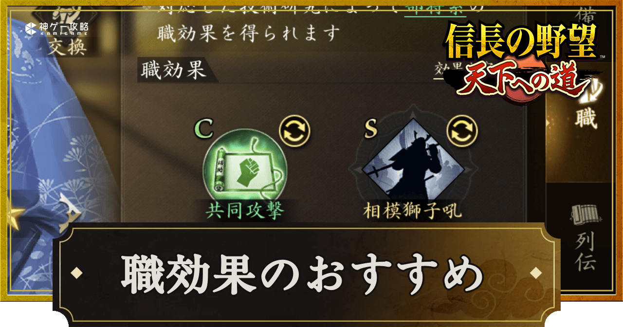 『信長の野望 天下への道』(信長天下道)の職効果のおすすめを紹介。おすすめ武将や厳選のやり方についても掲載しているため、信長天下道で職効果について知りたい時の参考にどうぞ。