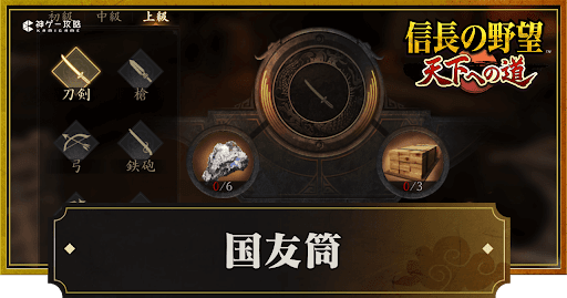 国友筒は、城内設備の「工房」で製作すると入手できる。特上品ランクの鉄砲製作には工房レベル2以上と、素材として南蛮鉄4個と檜材2個が必要になるので準備しておこう。また、製作は「雷粉式銃」「国友筒」「ピン打式銃」の3種類からランダムなので、必ず狙ったものが入手できるわけではない点に注意。