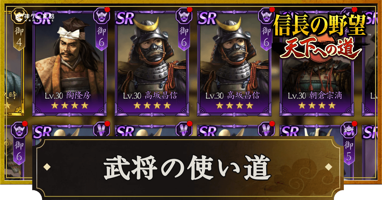SR武将は、部隊編制の際にSSR武将が足りない場合の空きを埋める際に使用できる。入手が簡単で兵種適性がSの武将もいるため、SSR武将が手に入るまではSR武将で補おう。