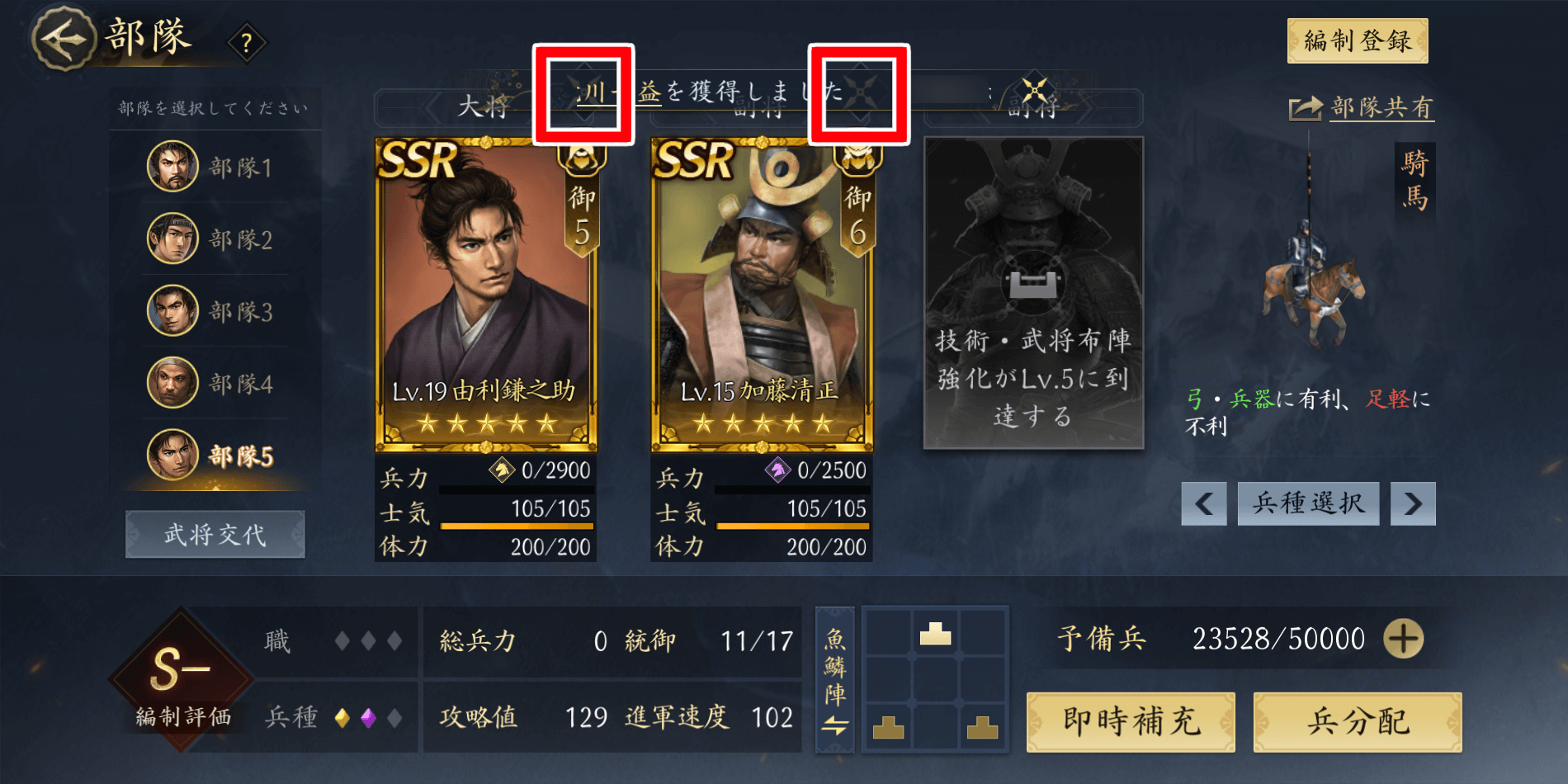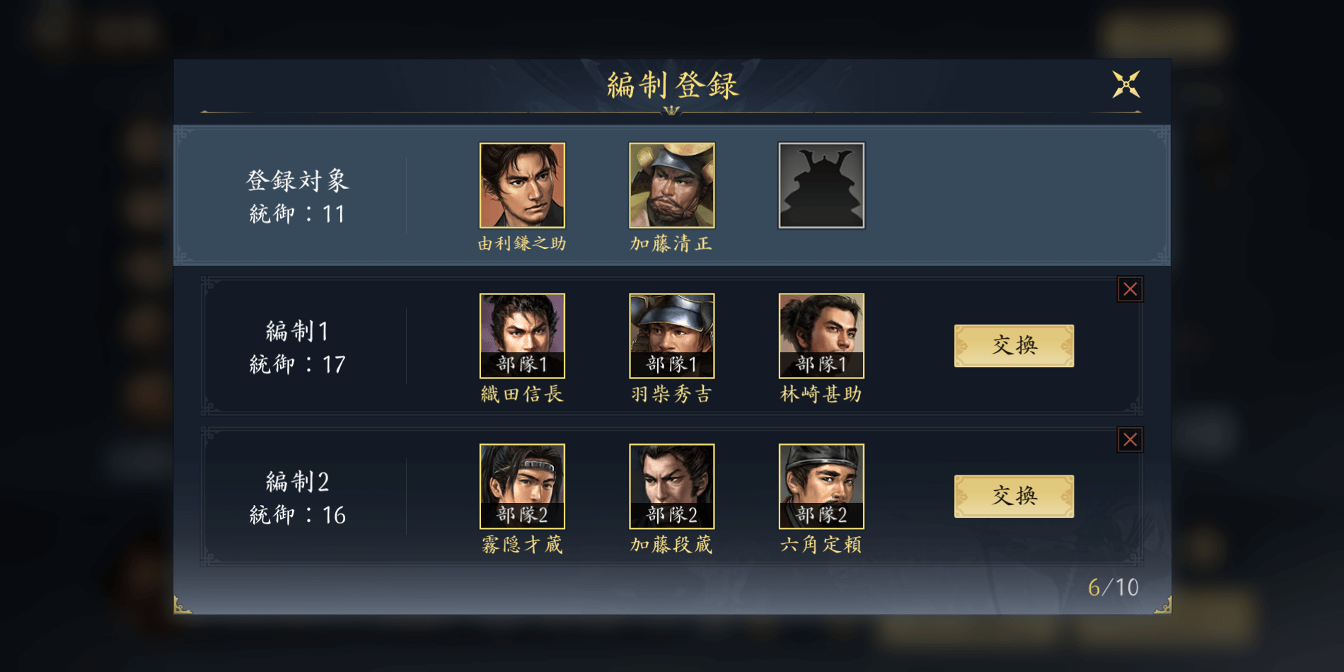 統御が足りず、想定した武将を入れられない場合は、似た動きができるSR武将も検討しよう。城内の天守レベルや研究の統御を進めれば編制コストは増えていき、最大で20まで上げるため、統御コスト7,7,6の組み合わせまで編制可能になる。