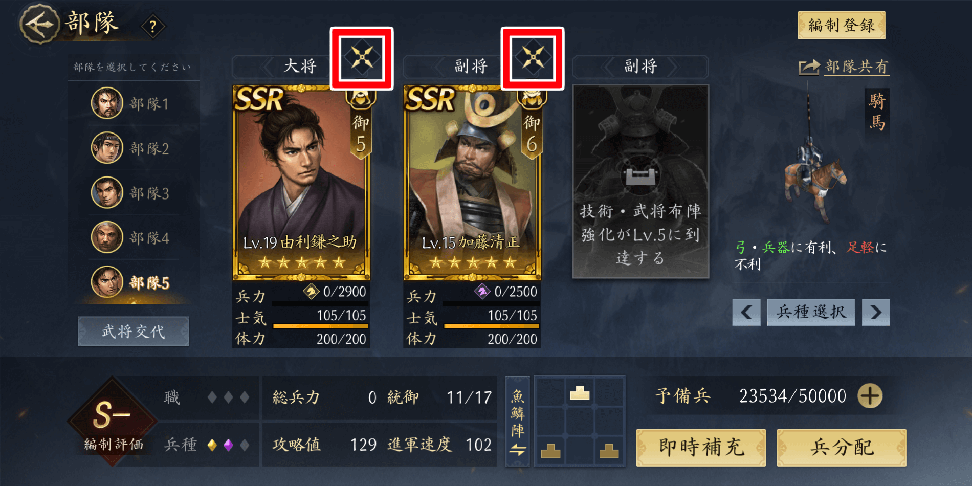 最初に作ったコンセプトに沿った武将を、副将に設定しよう。大将を活かして戦うのか、副将で戦って大将で耐えるのかなど、編制の可能性は無限大だ。