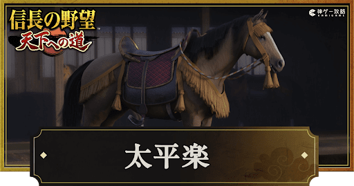 『信長の野望 天下への道』(信長天下道)の名馬「太平楽」について紹介。性能や強化される能力、どこで入手するかについても掲載しているため、信長天下道で太平楽について知りたい時の参考にどうぞ。