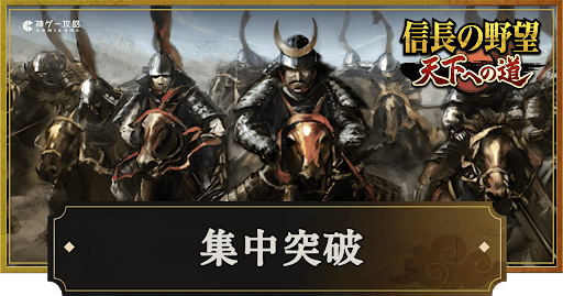 『信長の野望 天下への道』(信長天下道)の典籍戦法「集中突破」を紹介。効果や性能、入手条件についても掲載しているため、信長天下道で集中突破について知りたい時の参考にどうぞ。