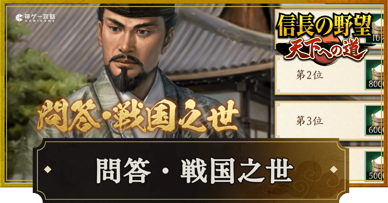 『信長の野望 天下への道』(信長天下道)のイベント「問答・戦国之世」を紹介。問答・戦国之世の答えや進め方についても掲載しているため、信長天下道で問答・戦国之世について知りたい時の参考にどうぞ。