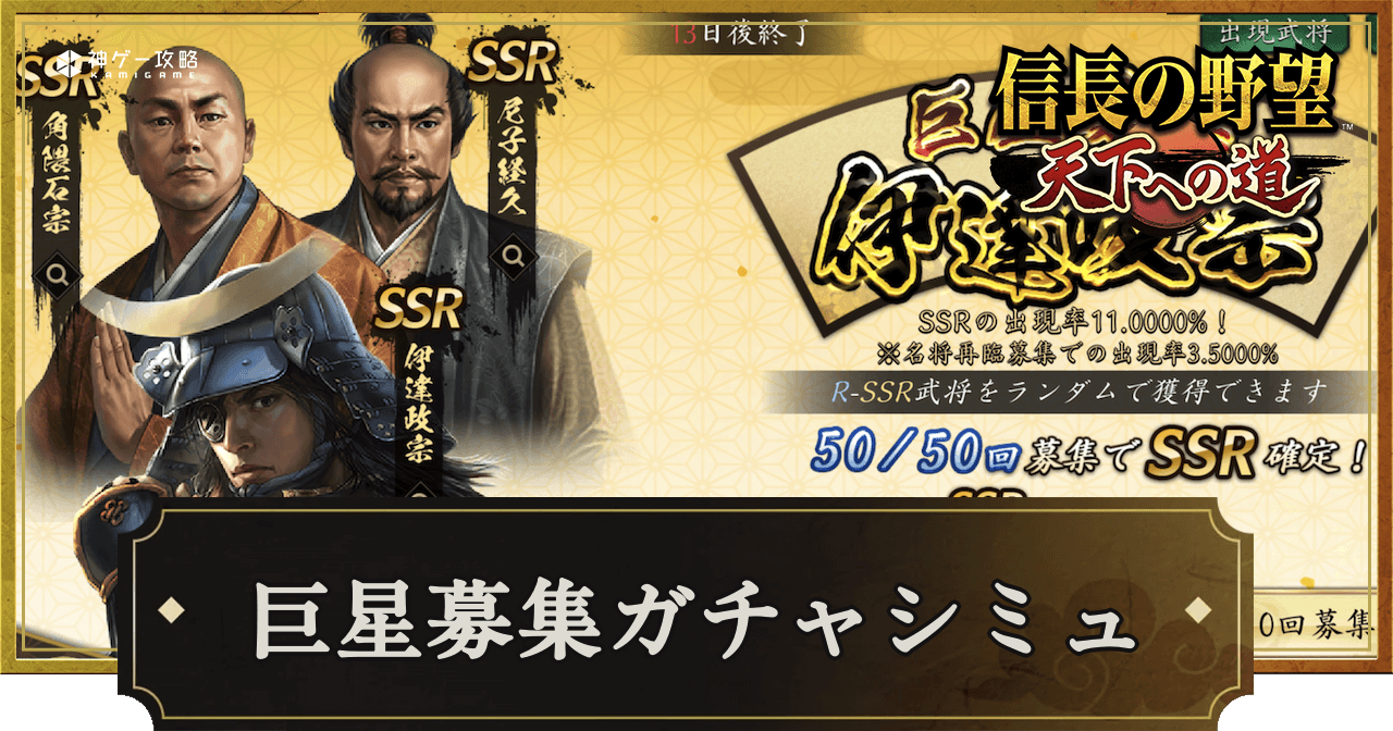 『信長の野望 天下への道』(信長天下道)における巨星募集 伊達政宗ガチャシミュレーターを掲載。単発や10連、好きなキャラが出るまで回せるガチャシミュレーターを掲載しているので、信長天下道で巨星募集 伊達政宗ガチャを引く前の運試しにどうぞ。