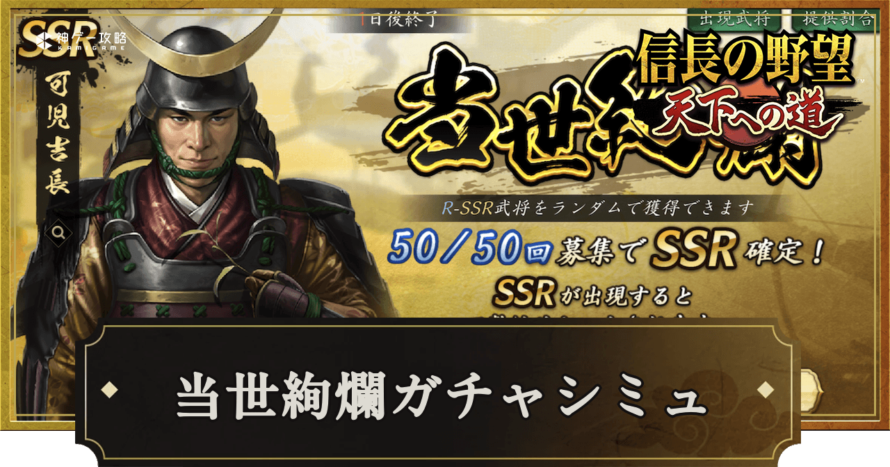 『信長の野望 天下への道』(信長天下道)における当世絢爛ガチャシミュレーターを掲載。単発や10連、好きなキャラが出るまで回せるガチャシミュレーターを掲載しているので、信長天下道で当世絢爛ガチャを引く前の運試しにどうぞ。