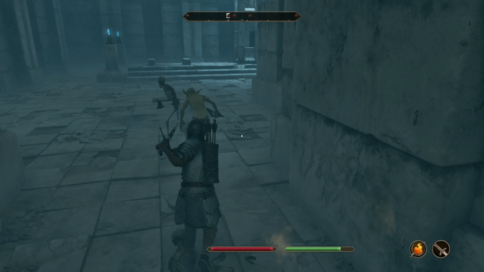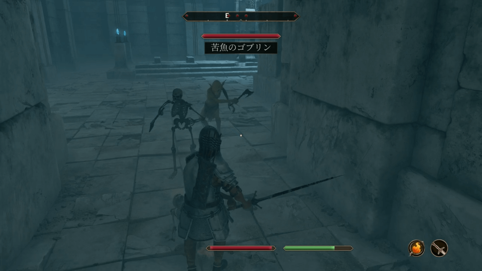 ミスカルカンドは大ウィルキン石さえ回収できればクリア可能なので、敵は無視してもOKだ。敵が多くて倒すのが面倒な場合やスケルトンとゴブリンが戦っていてプレイヤーに興味を示さない場合など、戦わなくても良い場面は多い。