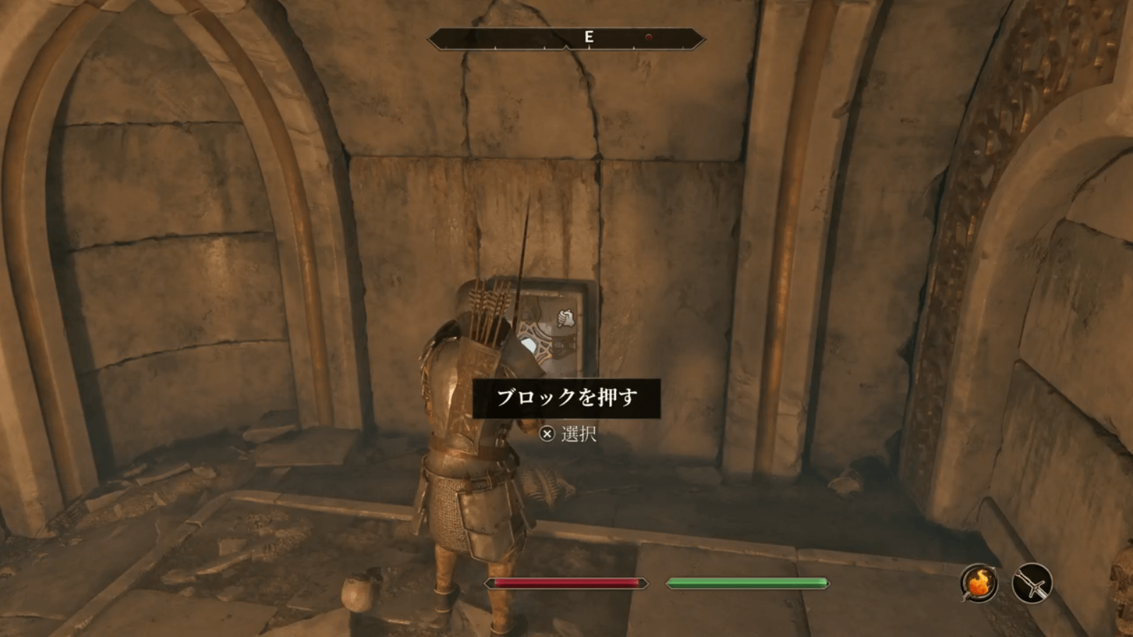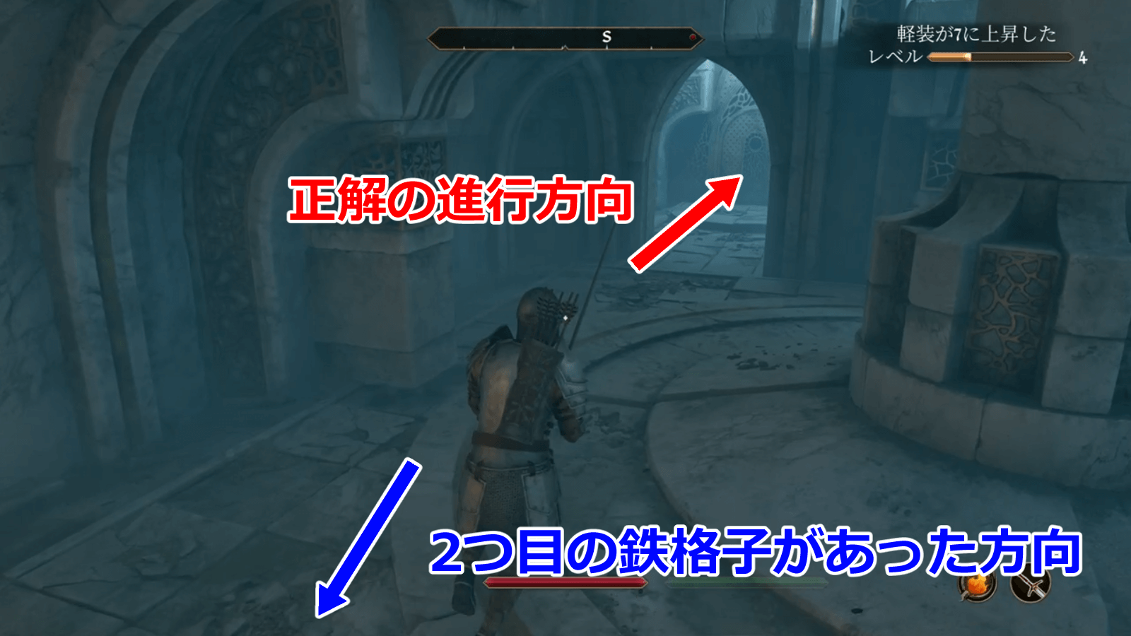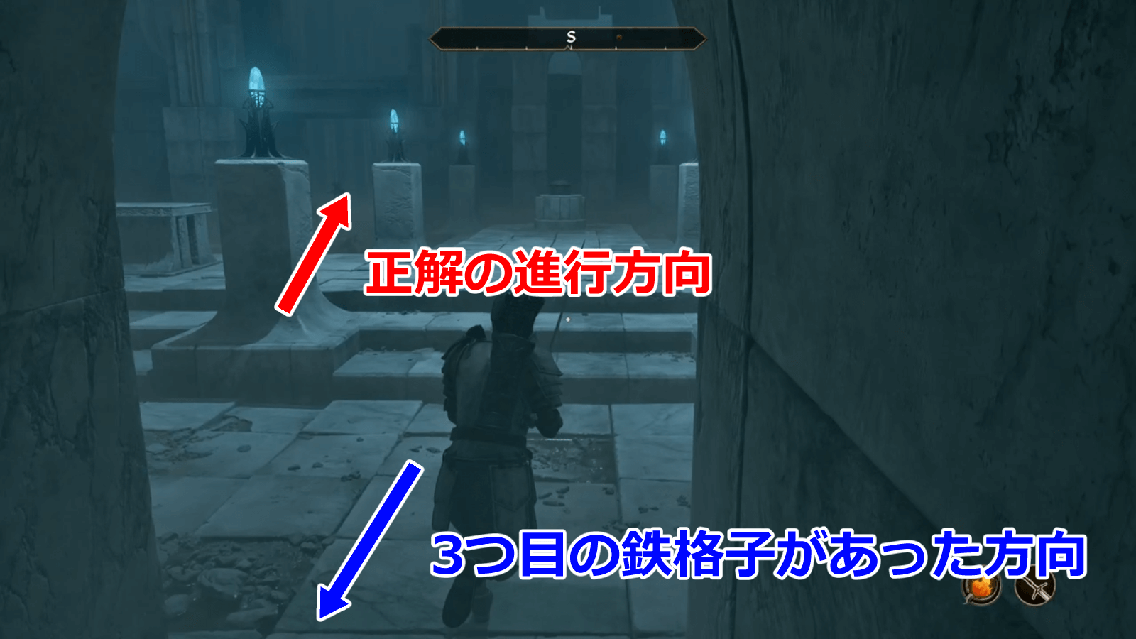 進行方向 スイッチ 3つ目の鉄格子を見つけたら、鉄格子と逆側を向いて左奥にあるスイッチを押しに行こう。スイッチは扉と扉の間にあるので、見逃さないように注意だ。