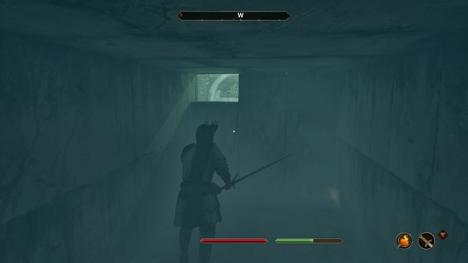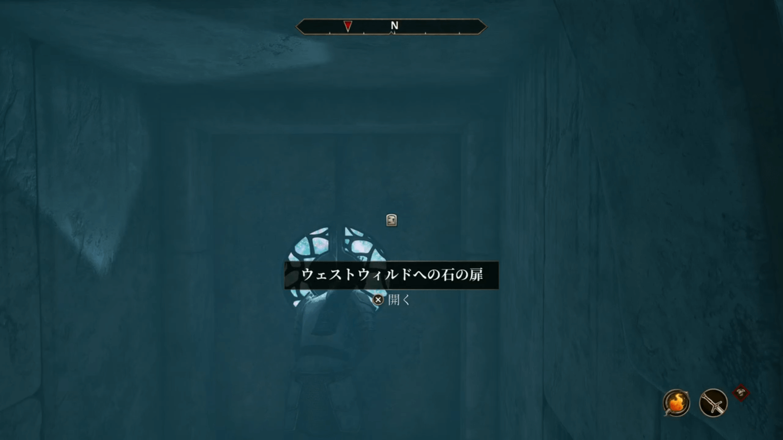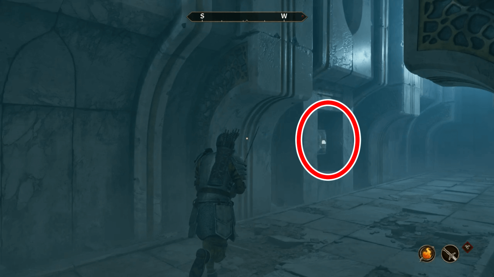 進行方向 スイッチ 3つ目の鉄格子を見つけたら、鉄格子と逆側を向いて左奥にあるスイッチを押しに行こう。スイッチは扉と扉の間にあるので、見逃さないように注意だ。