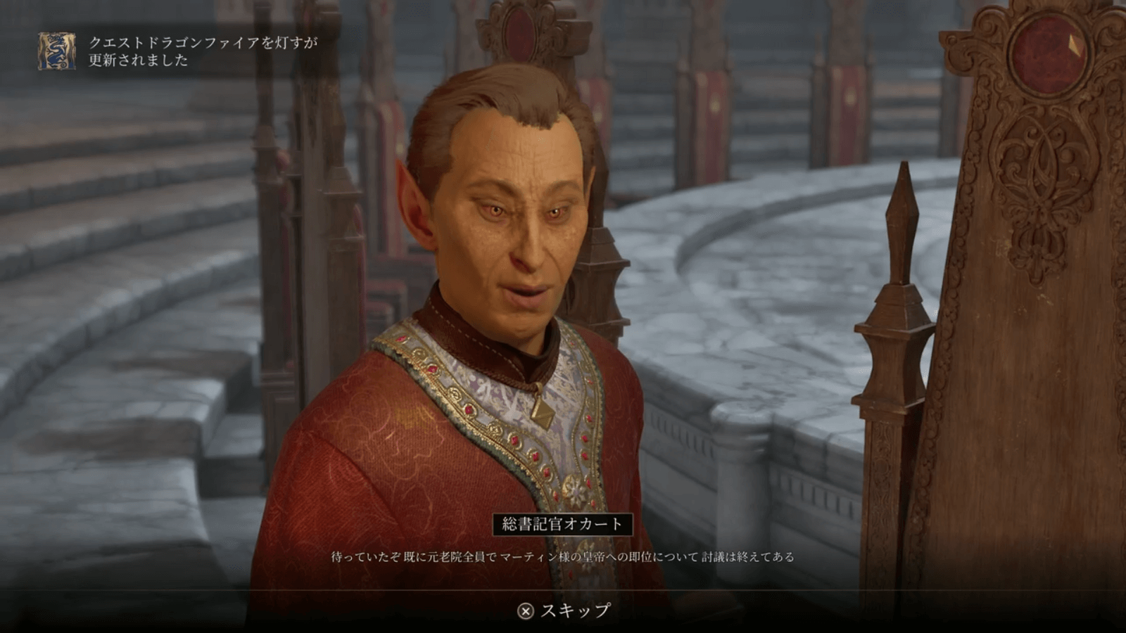 楽園クエストでマーティンと話したら、一緒に元老院の評議室へ行こう。マーティンはファストトラベルで付いてきてくれるが、元老院に入るまでは先に行動していてもクエストは進まないので、評議室へ一緒に入ると良い。