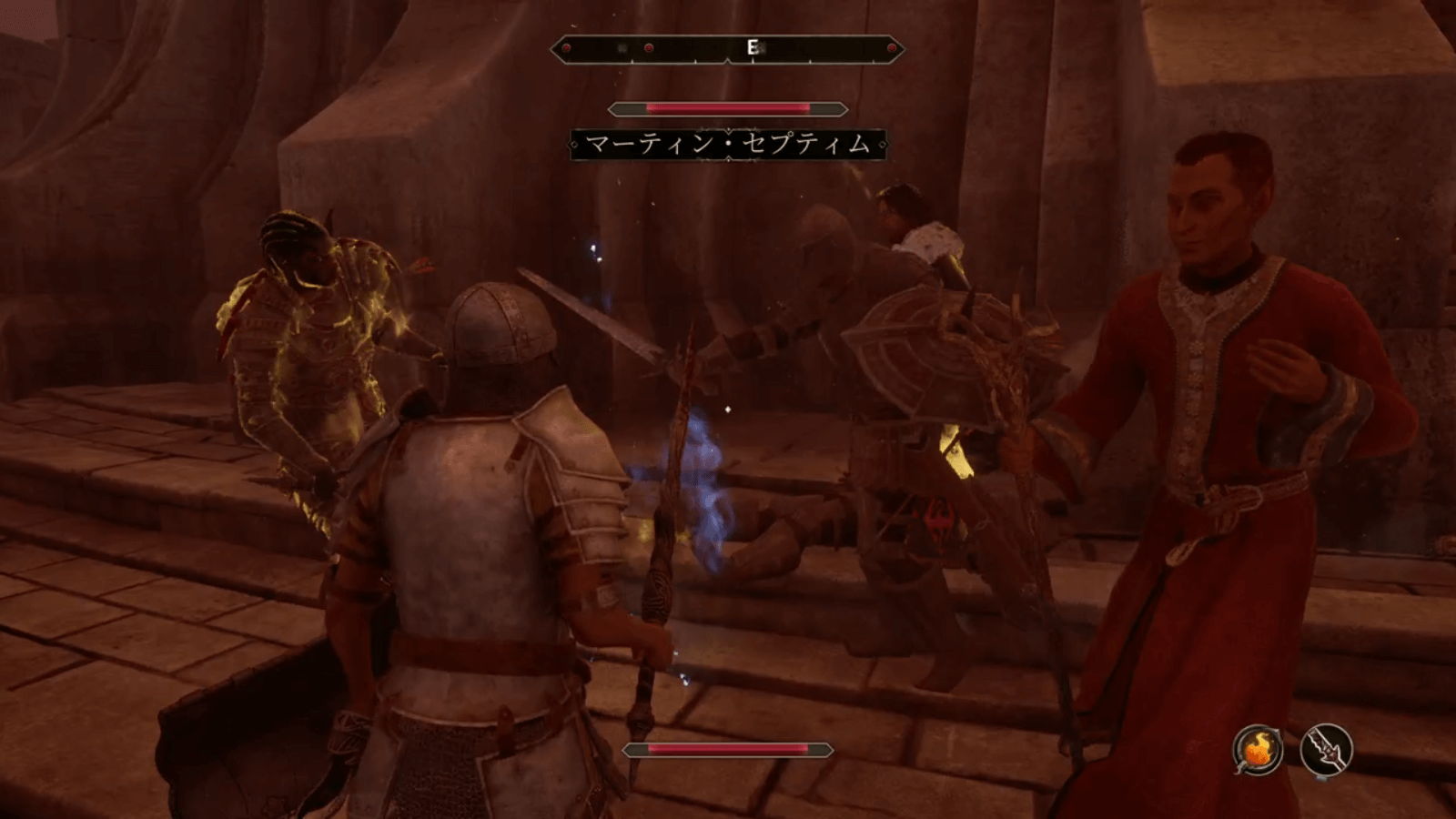 マーティンがオカートと話していると突如敵に襲われるので、敵を倒しながら外に出よう。なお、直前の会話ではバグの影響か字幕が表示されず英語音声のみになり操作が効かなくなるが敵が来ると動けるようになるため、慌ててロードし直さないようにすると良い。