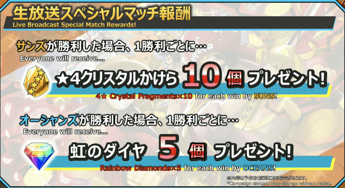 生放送スペシャルマッチで報酬が配布。サンズとオーシャンズに分かれ、両チームの勝利数に応じて配られる報酬が決定する仕組みだ。毎度お馴染みの企画だが、今回はクリスタルのかけらが10個、ダイヤが5個配布される。