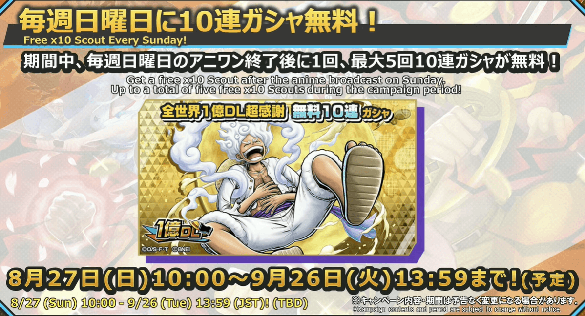 毎週日曜に無料10連ガチャが開催