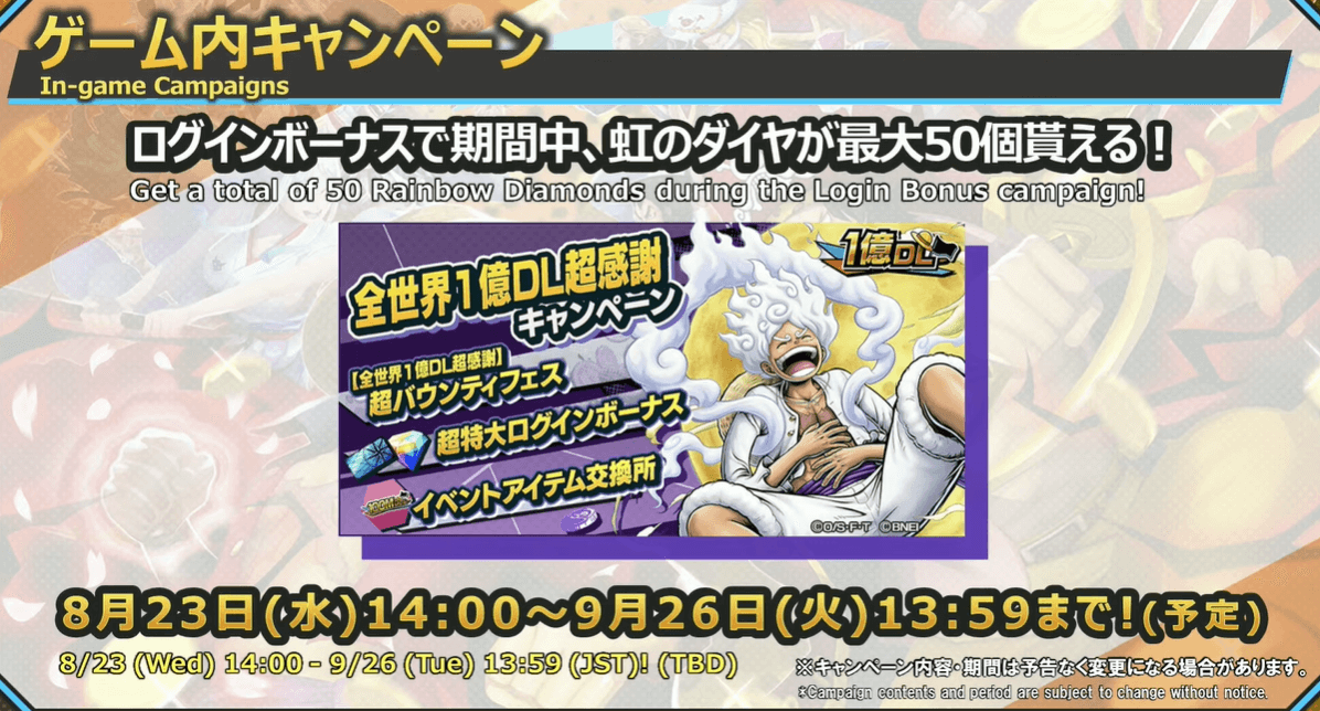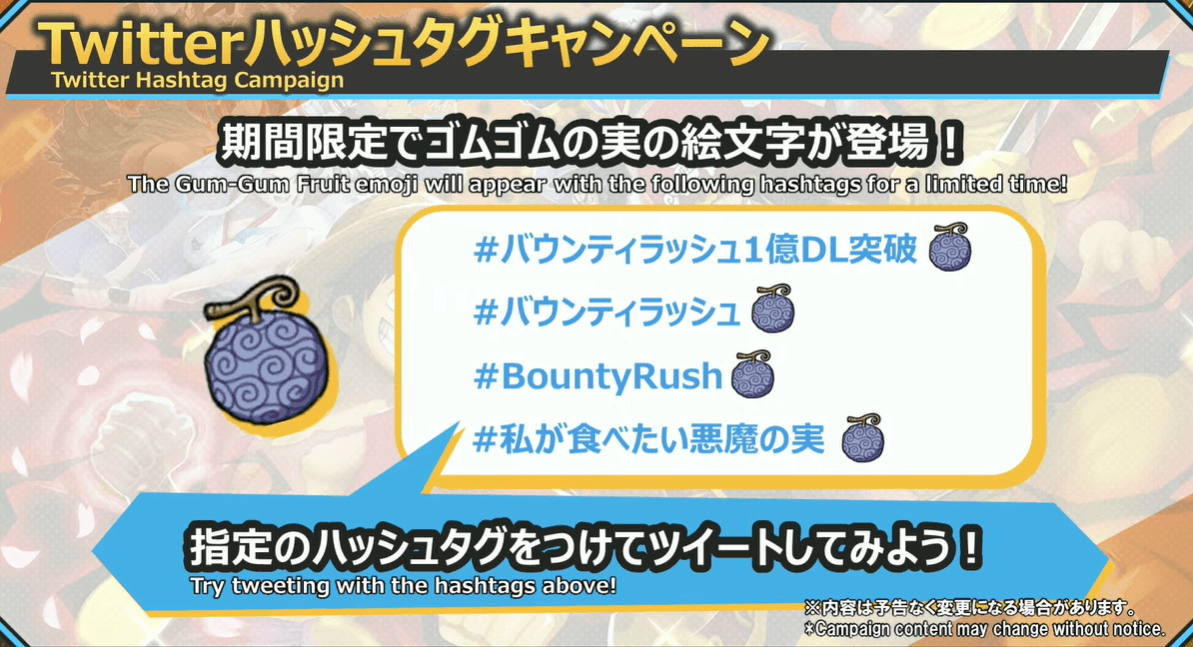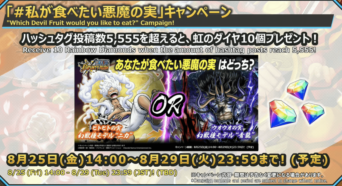 Twitter(X)でも各種キャンペーンが実施。特に注目なのは、ハッシュタグ「#私が食べたい悪魔の実」キャンペーンと、ギア5ルフィPVのいいね・RTキャンペーンだ。それぞれ、投稿数が5,555個を超えるとダイヤが10個、いいね・RTの合計数が50,000回を超えるとダイヤが20個配布される。