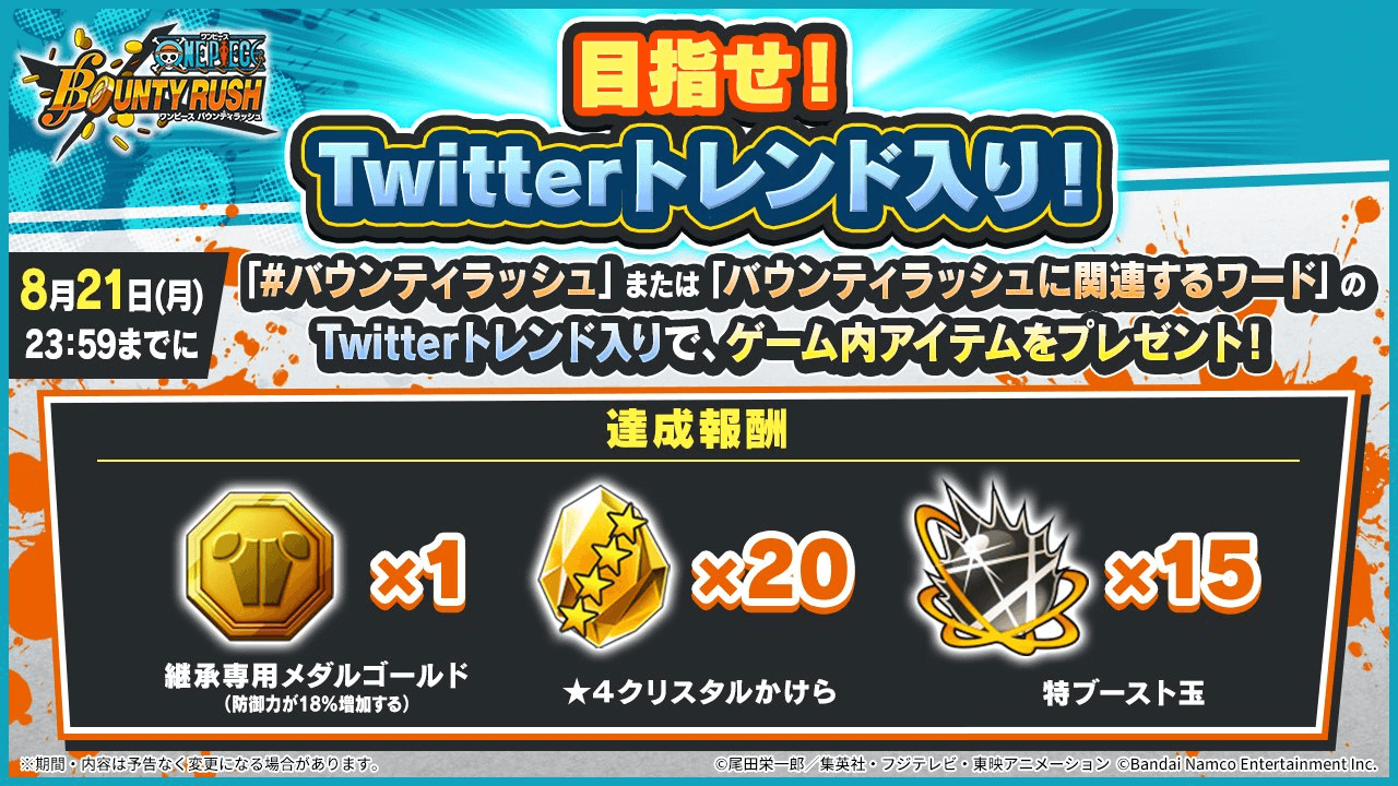 公式生放送に先駆けて、Twitter(X)のトレンド入りキャンペーンがスタート。「# バウンティラッシュ」もしくは「バウンティラッシュ関連ワード」のトレンド入りでゲーム内アイテムがプレゼントされる。