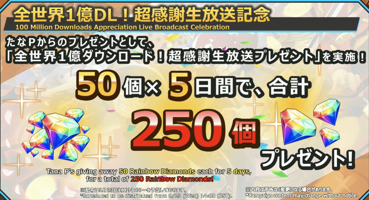 恒例のたなPさんからのダイヤ配布もあり。最初は250個の予定であったが、ゴー☆ジャスさんのファインプレーにより300個に増えた。毎日50個ずつ配布されるため、欠かさずログインしてダイヤを受け取ろう。