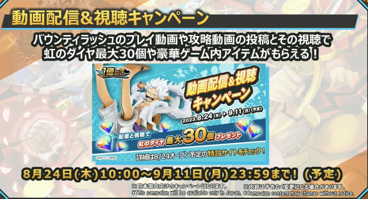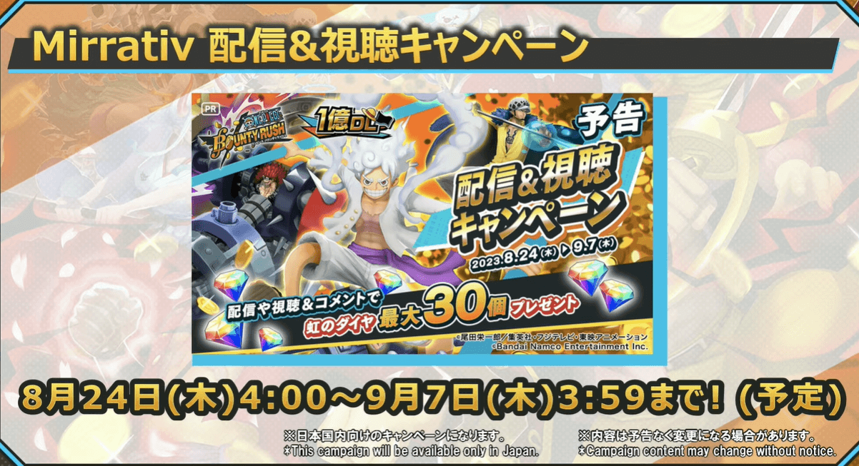 ワンピースバウンティラッシュの1億ダウンロード!超感謝生放送を紹介。アプリ内のキャンペーン情報や生放送当日の速報もいち早くお届けしているので、ONEPIECEバウンティラッシュをプレイする際の参考にどうぞ。