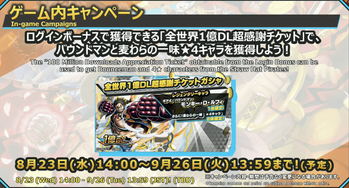 期間限定で「1億ダウンロード超感謝ガチャ」がリリース決定。ログインボーナスで獲得できる「チケット」を消費してガチャを回す。バウンドマンルフィと麦わらの一味★4キャラ2体が確定で排出する神ガチャだ。
