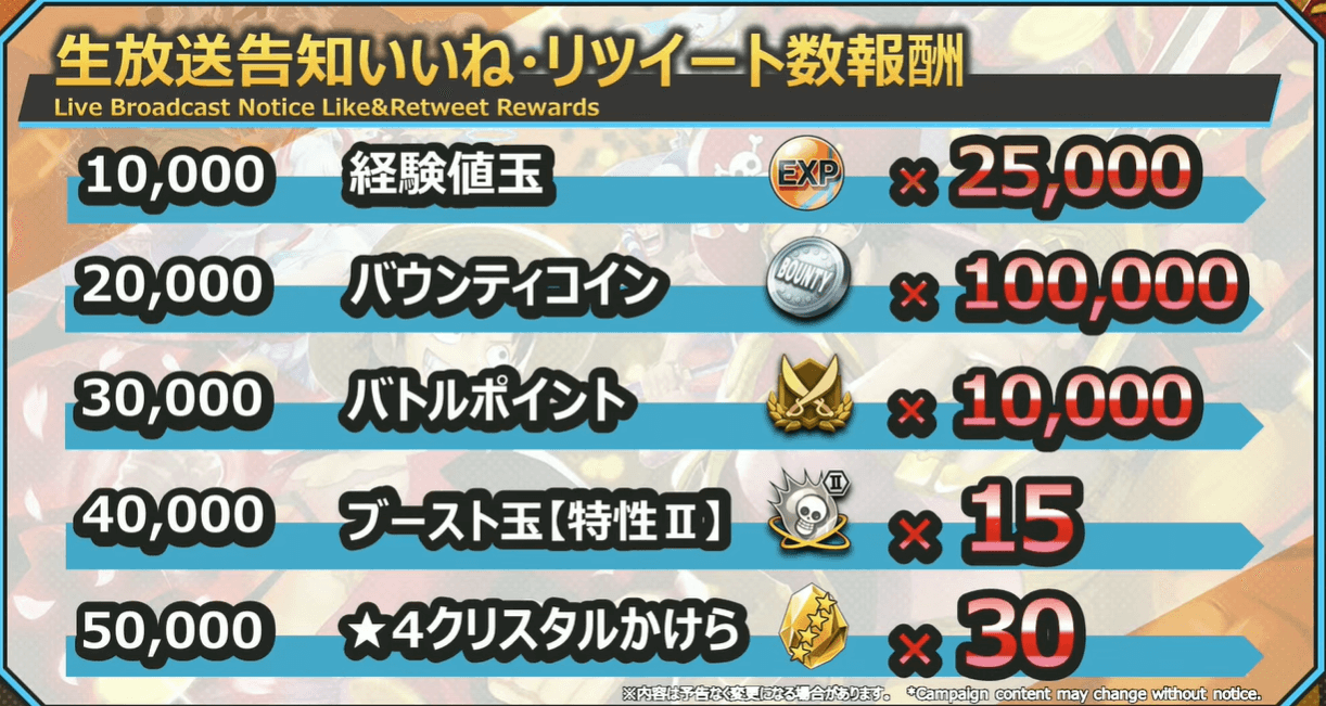 生放送に先駆けて開催されていた、いいね・RTキャンペーンの報酬量が確定。5万を目標にしていたが、合計で8万を達成し全ての報酬が配布されることになった。後日ゲーム内のプレゼントBOXから受け取れるので、忘れずにゲットしよう。