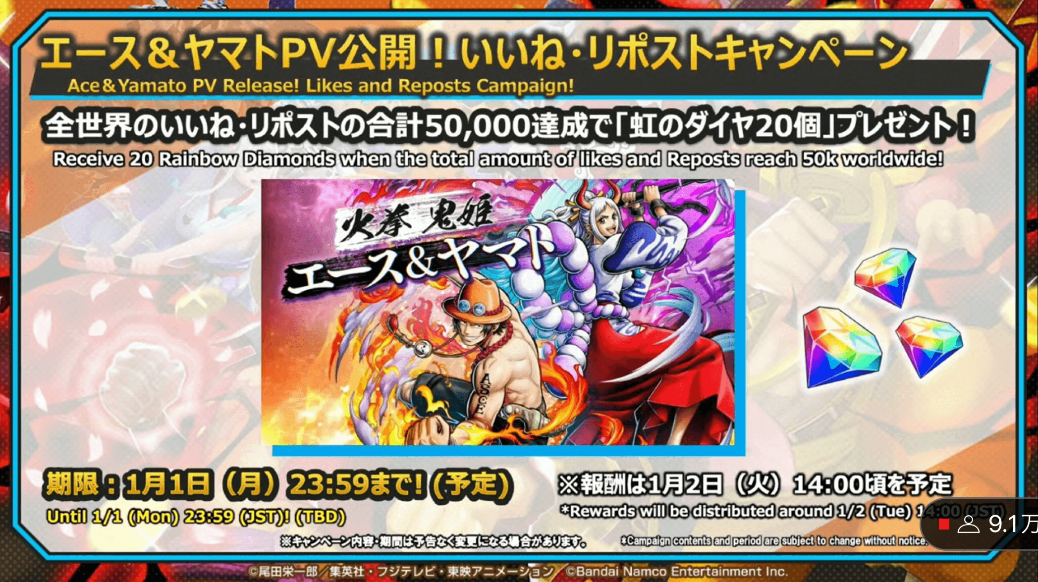 生放送終了後にいいね・リポストキャンペーンが開催。全世界のいいね・リポストが合計50,000件に達すると虹のダイヤ20個が配布される。
