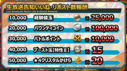 生放送の告知で使用されたポストのエンゲージメントが合計を50,000件を超えたため、豪華報酬が配布される。配布日は未定なので続報を待とう。
