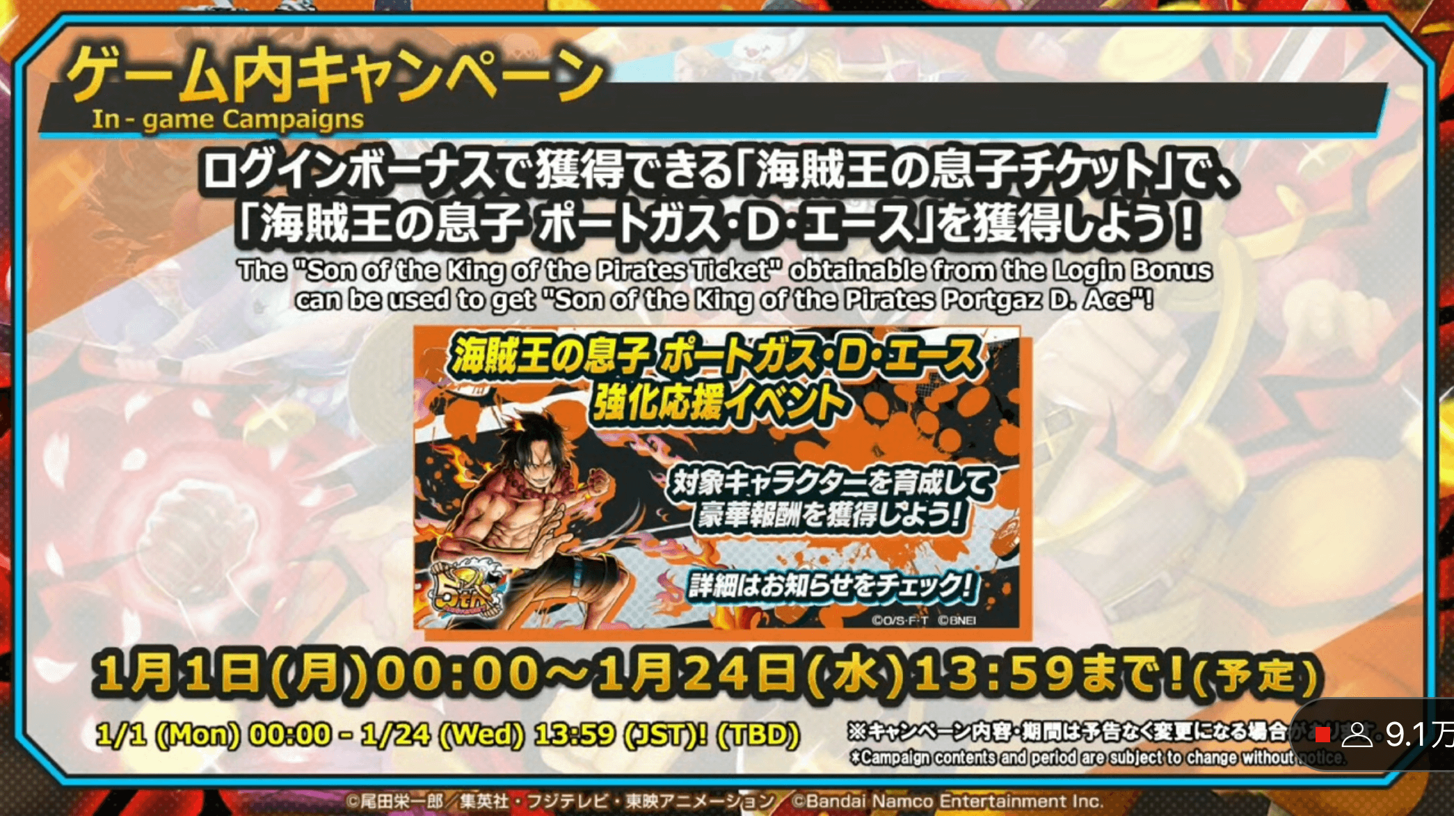 ログインボーナスでもらえるチケットを使用して回せる海賊王の息子チケットガチャが開催。「海賊王の息子 ポートガス・D・エース」が確実に1体獲得できる。