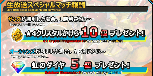 生放送スペシャルマッチの結果によって報酬が配布される。マッチの結果、クリスタルのかけらが30個配布される。
