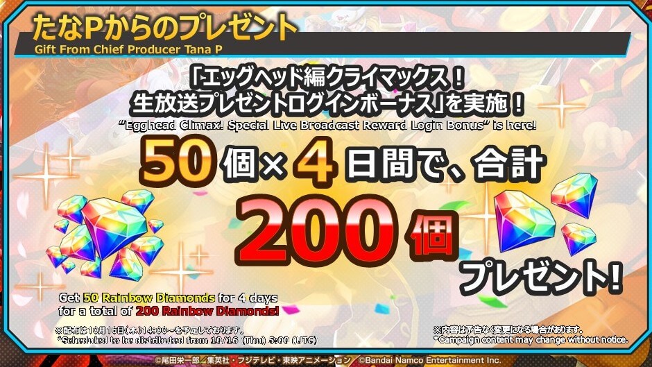 生放送を記念して、ダイヤ200個がチーフプロデューサーのたなPさんから配布予定。1日50個ずつで、計4日間にわたって配布される。