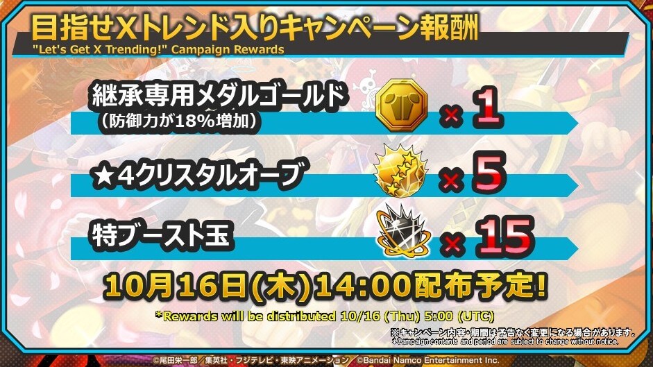 生放送で行われたXトレンド入りの報酬が配布決定。継承専用メダルや星4クリスタルオーブなどの貴重なアイテムが配布内容だ。報酬は、バウンティラッシュアプリ内TOPのプレゼントボックスから受け取れる。