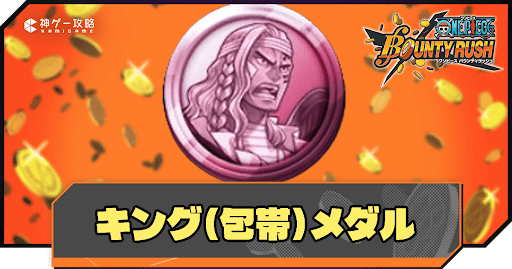ワンピースバウンティラッシュの「キング(包帯)メダル」について紹介。生成キャラや追加特性を始めとした基本情報に加え、キング(包帯)メダルと相性の良いメダル編成や装備キャラについても解説しているので、キング(包帯)メダルを強化する際の参考にどうぞ。
