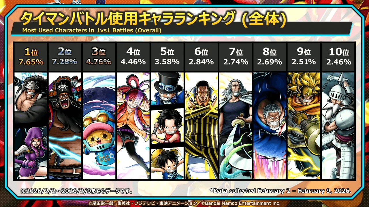 3月特別生放送にて、シーズン1の使用率が発表された。使用率1位は全体とLEGENDランクのどちらもくま&ボニーだ。他には、四皇黒ひげや黄猿を対策できるヴェルゴや、状態異常の付与とスキルクールタイムの追加が優秀なジャッジなど、リーグバトルでは見られないキャラもランクインしている。