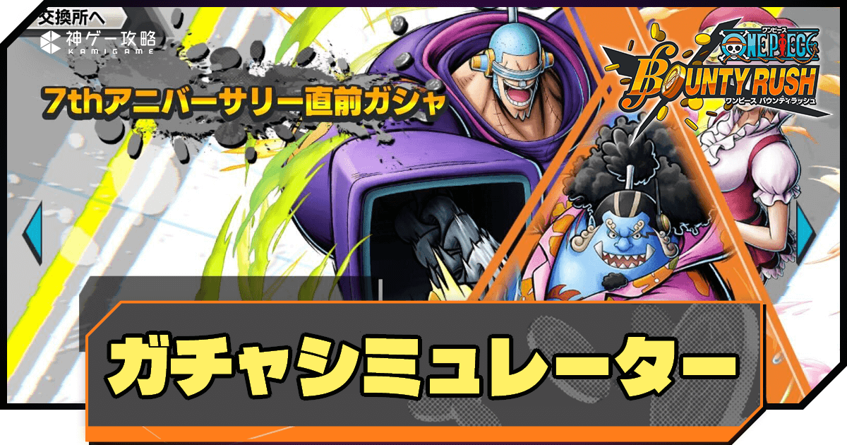 ワンピースバウンティラッシュ「7thアニバーサリー直前ガチャ」のガチャシミュレーター。ONEPIECEバウンティラッシュでガチャを引く前の運試しや、狙いのキャラを引ける確率を見極めるための参考にどうぞ。