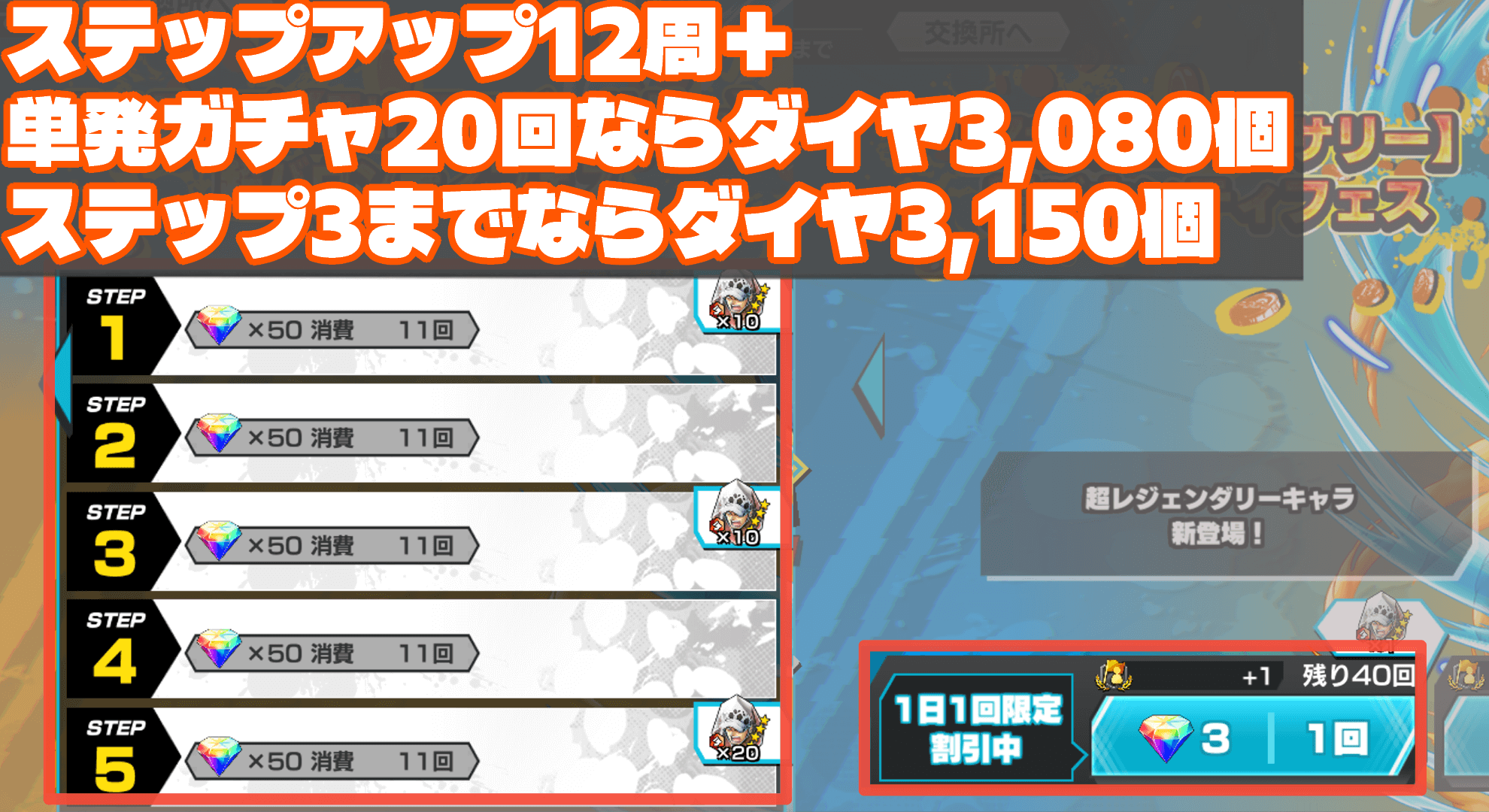 ワンピースバウンティラッシュのロー超フェスガチャを紹介。ピックアップキャラの評価やガチャを引くべきかについて解説しているので、ONEPIECEバウンティラッシュで超フェスガチャを引く際の参考にどうぞ。