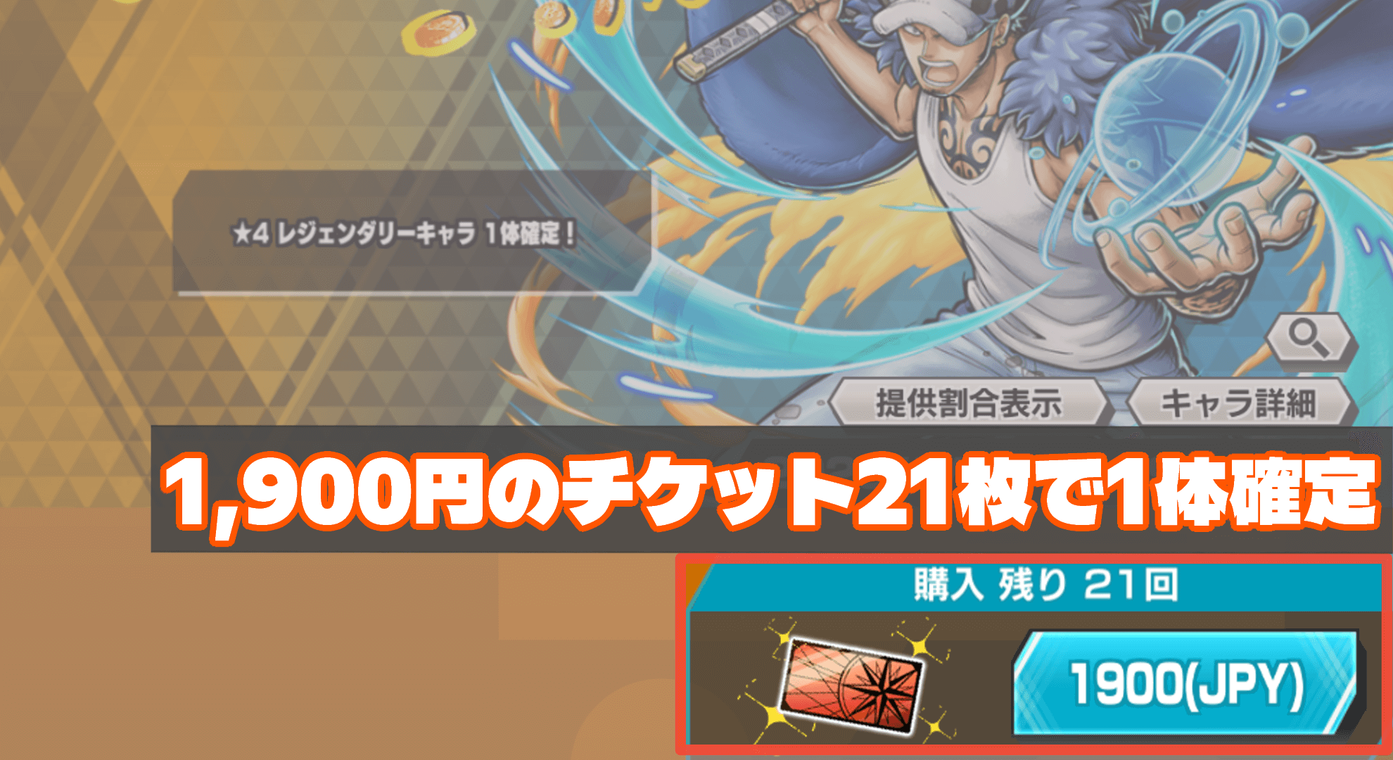 ローは、課金だと38,400円で確定入手できる。黄猿超フェスのようなSPチケットステップアップガチャのSTEP1で確定する仕様だ。ステップアップガチャを引くのに、課金チケットガチャでSPチケットを21枚集める必要がある。