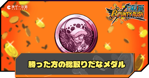 ワンピースバウンティラッシュの「勝った方の総取りだなメダル」について紹介。生成キャラや追加特性を始めとした基本情報に加え、勝った方の総取りだなメダルと相性の良いメダル編成や装備キャラについても解説しているので、勝った方の総取りだなメダルを強化する際の参考にどうぞ。
