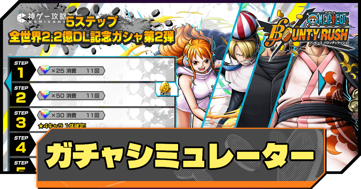 ワンピースバウンティラッシュにおける「全世界2.2億DL記念ガチャ第2弾」のガチャシミュレーター。ONEPIECEバウンティラッシュでガチャを引く前の運試しや、狙いのキャラを引ける確率を見極めるための参考にどうぞ。
