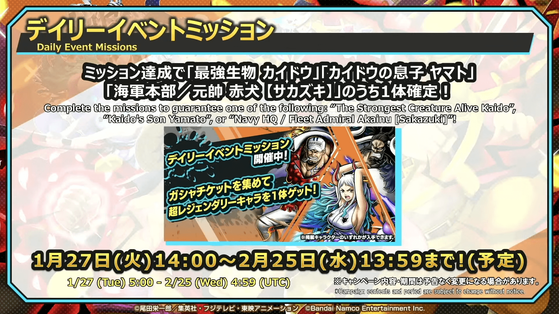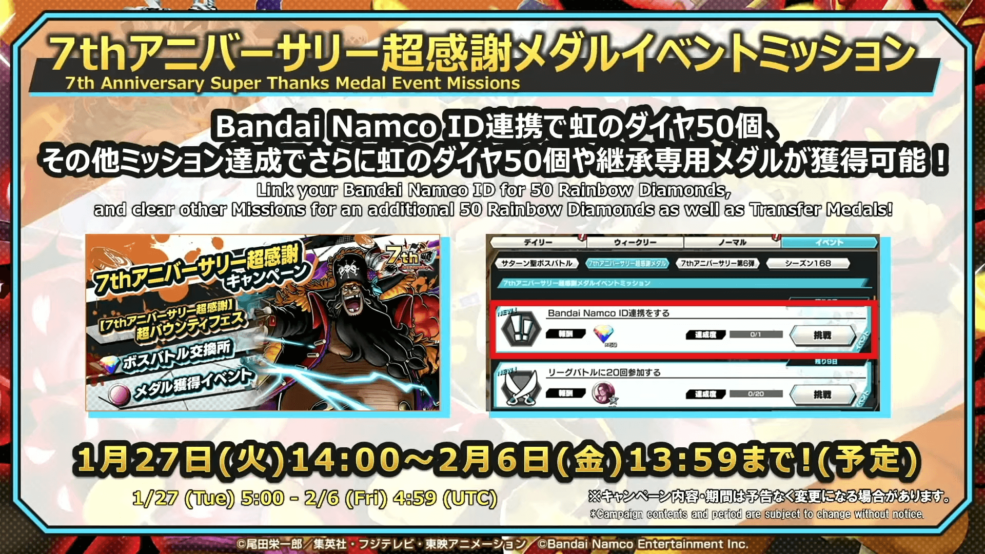 黒ひげ実装に合わせて、イベントメダルが入手できるミッションが開催される。イベントメダルの強化を進めるとほとんどのミッションがクリア可能だ。また、「Bandai Namco ID」を連携するだけでダイヤが50個入手できるため、必ず連携をしよう。